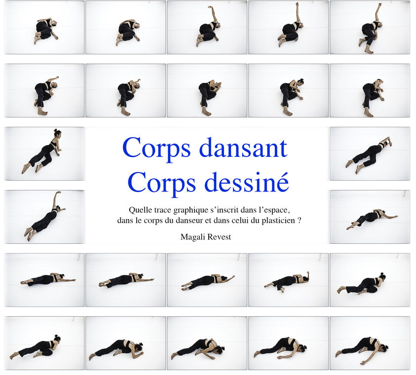 J’articule mon propos dans le cadre d’un mémoire écrit de recherche, autour de mon expérience d’artiste que je mets en regard avec d’autres démarches artistiques qui utilisent la danse comme source d’inspiration. Dans mon mémoire de recherche ‘j’ai fait la synthèse sur trois démarches distinctes : le travail d'Ernest Pignon-Ernest avec Bernice Coppieters le duo Bertrand Lombard (Chorégraphe) et Patrick Bossatti (Dessinateur) et ma démarche de danseuse et dessinatrice. Chacune des démarches interrogent l’implication du corps dans l’espace, que ce soit celui de la feuille, de la scène, de la rue ou des espaces naturels. Elles nous démontrent que selon les contextes et les espaces, les corps se projettent différemment.